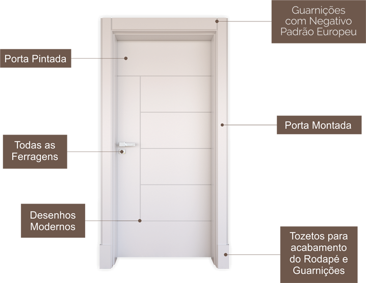Nossas portas são entregues totalmente pintadas, montadas e com as ferragens alto padrão para um bom funcionamento, você não precisa se preocupar com nada! É só pedir, esperar e abrir!